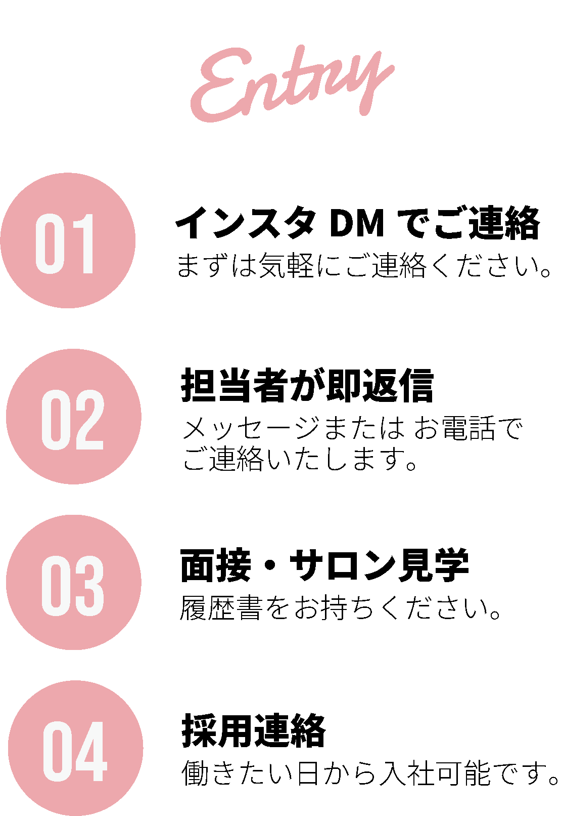 「お問い合わせ内容:①氏名/②住所/③現在の状況(美容学校在学中、転職活動中など。)/④電話番号/見学、応募、ご質問等」