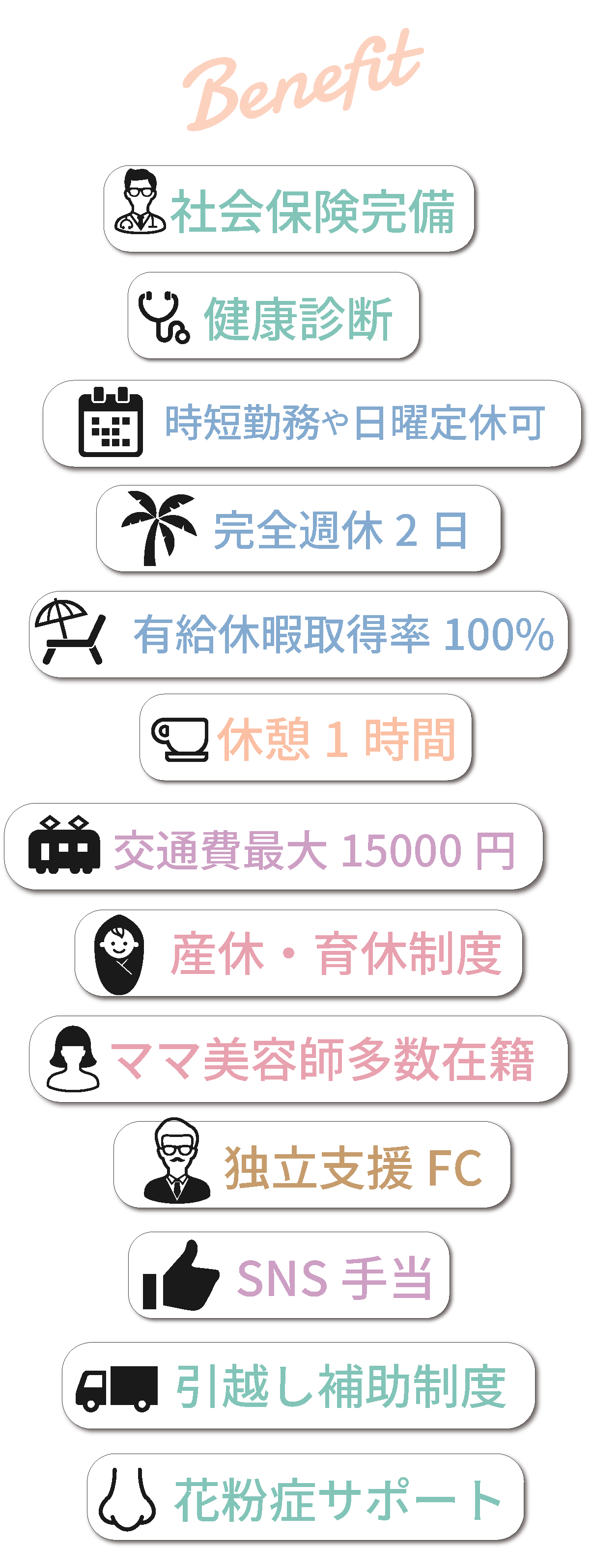makeaでは、スタッフの方々に快適な労働環境を提供するため、週休2日制や8時間労働を実現し、 休憩1時間をあたりまえに確保しています。残業は一切なく、社会保険も完備。 美容師の皆さんが自分自身のスキルアップやクリエイティビティに集中できるよう、理想的な職場環境を整えています。 ※タオル洗濯などの業務軽減や社会貢献としてタオルリース事業なども行っています。